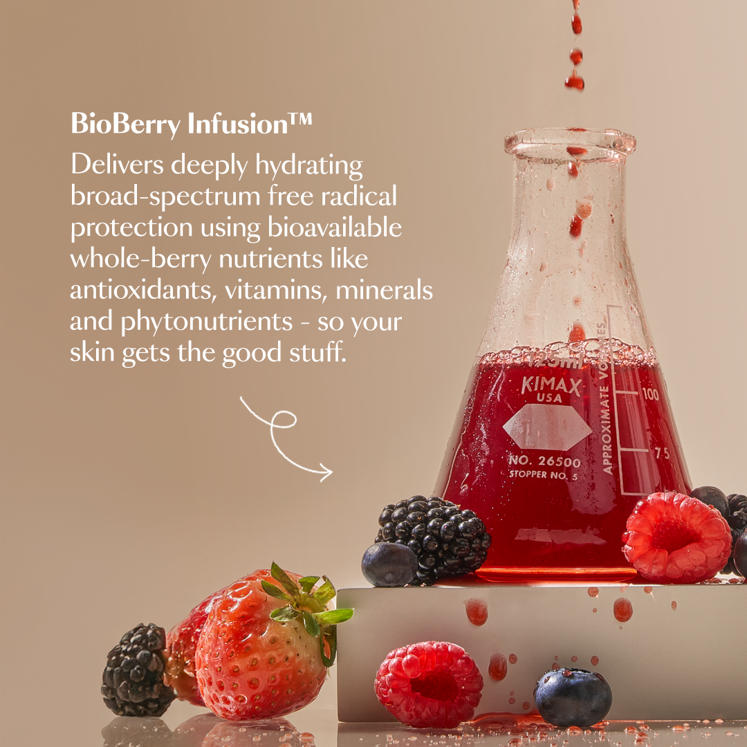 Did you know most skincare only defends against one type of free radical? Our patented BioBerry Infusion™ delivers broad-spectrum free radical protection by preserving the full nutrient matrix of real berries— antioxidants, vitamins, minerals and phytonutrients included. Thanks to our High Pressure Processing (HPP) technology, nothing gets stripped or heat damaged. Your skin gets the good stuff in its most active, bioavailable form—just like it would from nature.